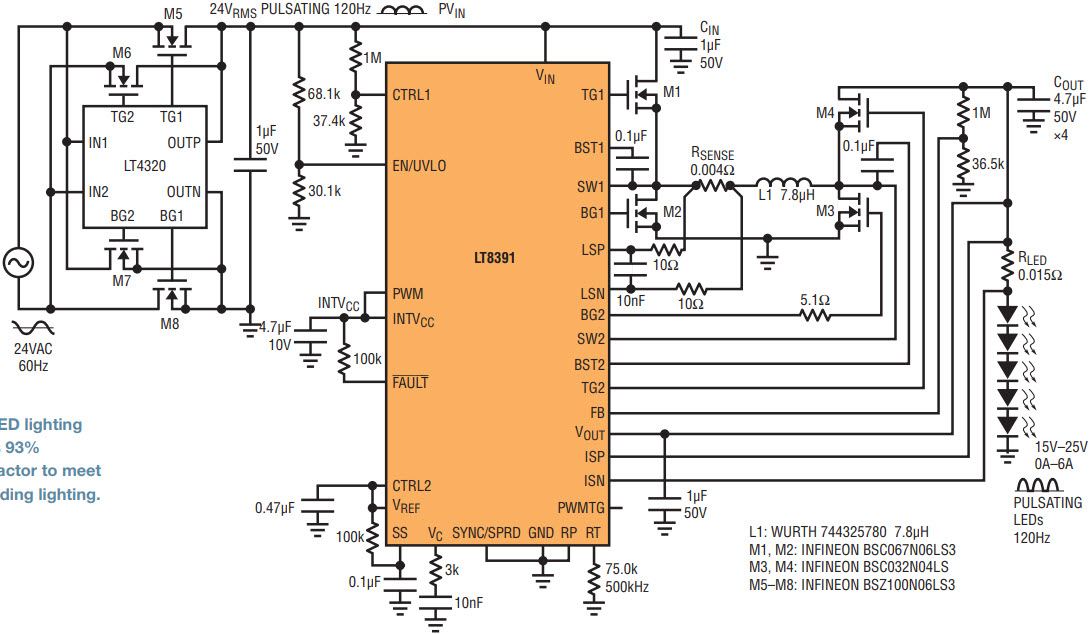 The 84W AC LED lighting converter in Figure 14 powers 15V–25V of LEDs at120Hz AC currents peaking as high as 6A. A full-wave rectifier converts 24VAC at 60Hz into a 120Hz half-wave at the input of the LT8391. Four-switch conversion allows the LT8391 to move between boost, buck-boost and buck regions of operation and regulate an AC LED output with high power factor at the input. The waveforms in Figure 15 demonstrate 98% power factor while maintaining 93% efficiency at a very high power. The thermal scan in Figure 16 shows the full wave rectifier.