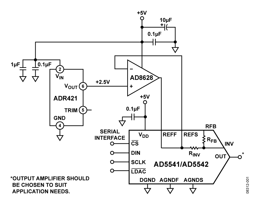 出力バッファの性能はシステムの帯域幅とアプリケーションの要求に応じて、速度またはDC精度に対して最適化されうるものなので、この回路には出力バッファはありません。出力バッファとしてはAD5661が優れています。これは5V~16Vの単電源アンプで、アナログ・デバイセズの特許取得済みDigiTrim™技術を使って低いオフセット電圧を生成します。このデバイスは小さな入力バイアス電流と広い信号帯域幅を特長とします。また、 AD8605 や AD8655も適したデバイスです。