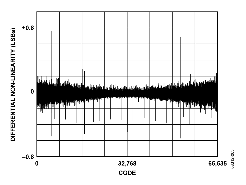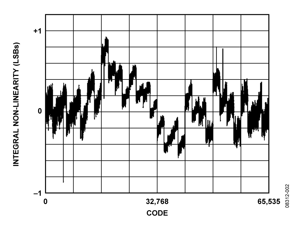 積分非直線性(INL)誤差は、DACの理想的な伝達関数からの実際の伝達関数のLSB単位の偏差を示します。DNL誤差は、実際のステップ・サイズと1LSBの理想値との差を示します。図1の回路は、INL誤差とDNL誤差がともに±1LSBの16ビット分解能を備えています。この回路のINL性能を図2に、DNL性能を図3に示します。