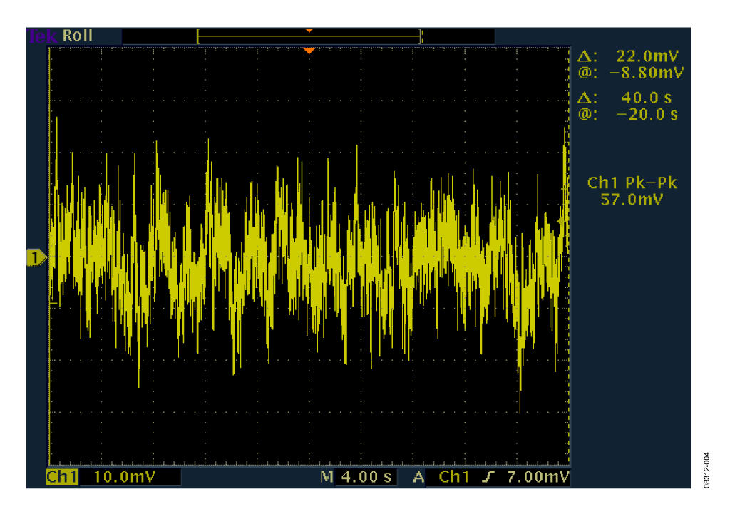 回路の0.1Hz~10Hzのノイズ・プロットを図4に示します。DAC出力VOUTを、後段でゲイン10,000のアンプと帯域幅が0.1Hz~10Hzのフィルタの入力に接続しました。図のオシロスコープ波形では電圧ノイズが捉えられています。57mVの非常に小さいピークtoピーク電圧が観測されます(DAC出力では5.7μV)。