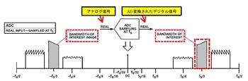 図 3 では入力信号の周波数を+fs/3(fs [Hz]はサンプリング周波 数)、そして変調信号などを想定して中心周波数に対して帯域 幅があるかたちとなっています。そのスペクトルがプラスの周 波数軸上(+fs/3)には「BANDWIDTH OF INTEREST」として 本来の信号という意味合いで表記され、マイナスの周波数軸上 (−fs/3)には「BANDWIDTH OF INTEREST IMAGE」としてイ メージ周波数の成分という意味合いで表記されています。ここ までの説明、そしてデジタル信号処理理論の視点からは、実際 はどちらの信号も「本来の信号」といえるものです。