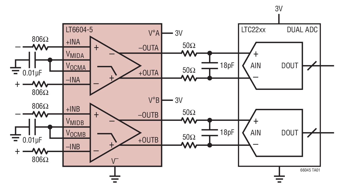 利得と位相は2つのチャネル間で十分に整合されています。各チャネルの利得は2本の外付け抵抗で個別に設定されます。LT6604-5は調整可能な出力同相電圧を供給することによってレベルシフトを可能にするので、ADCに直接インターフェイスするのに最適です。LT6604-5は3V動作向けに完全に規定されています。差動設計により、単一3V電源で動作しながら2VP-Pの信号レベルで優れた性能を実現することができます。