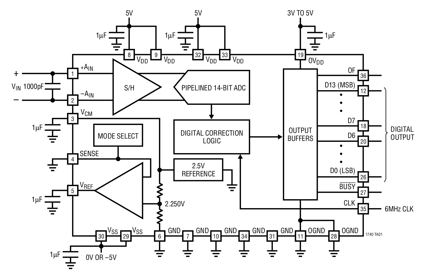 LTC1740は、6Msps、14ビット・サンプリングA/Dコンバータで、 単一5Vまたは±5V電源で動作し、消費電力はわずか245mWです。使いやすいこのデバイスは、広いダイナミック・レンジをもつサンプル&ホールドと、プログラム可能な高精度リファレンスを搭載しています。