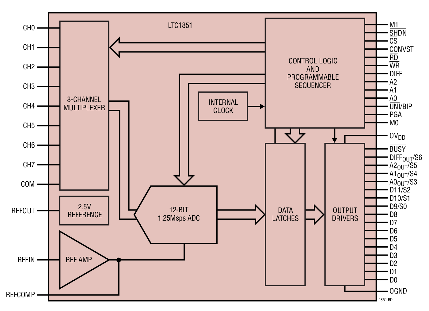 10ビットのLTC1850と12ビットのLTC1851は、 完全な8チャネル・データ収集システムです。柔軟性の高い8 チャネル・マルチプレクサ、 サンプル・ホールド付き 1.25Msps逐次比較型アナログ-デジタル・コンバータ 、 2.5Vリファレンスおよびリファレンス・バッファ・アンプ、パラレル出力インターフェイスを内蔵していま す。 マルチプレクサは、シングルエンドまたは差動入力、2つの利得範囲、およびユニポーラまたはバイポー ラ動作用に構成可能です。