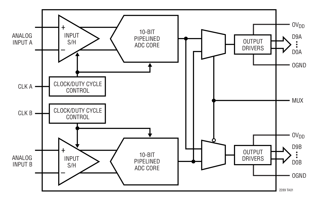 単一3V電源により、低消費電力動作が可能です。個別の出力電源により、0.5V ~3.6Vロジックをドライブする出力が可能です。オプションのマルチプレクサにより、1つのデジタル出力バスを2つのチャネルで共有することができます。