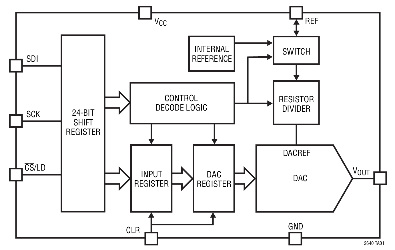 LTC2640 D/Aコンバータは、最大50MHzのクロック・レートで動作する3線式のSPI/MICROWIRE™互換シリアル・インタフェースを採用しています。