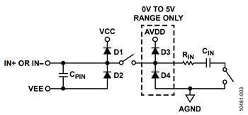 Figure 3 shows an equivalent circuit for the input structure of the AD7610 and AD7612. The analog input is first handled by the high voltage branches (powered by VCC and VEE) and scaled down to 0 V to 5 V.
