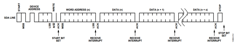 A flowchart of the slave receiving bytes from the master is shown in Figure 11. Figure 12 shows when the status bits are set and when the interrupts occur.