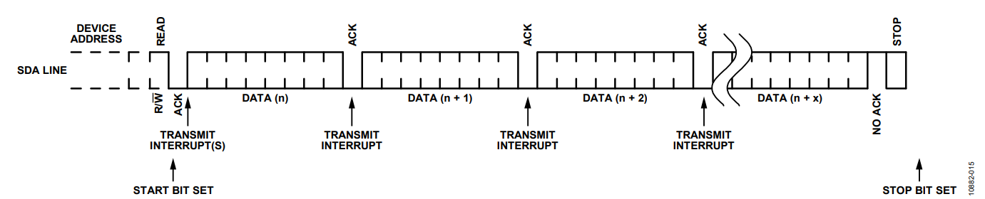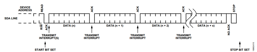 An I2C interrupt is generated on the first clock of a byte transmitted, when the transmit FIFO is empty or not full, and Bit 2 in I2CMSTA is set, indicating that the master has just transmitted a byte. This allows the user to add a byte to the FIFO. The status of the FIFO can be check in I2CMSTA[1:0] or the I2CFSTA register.