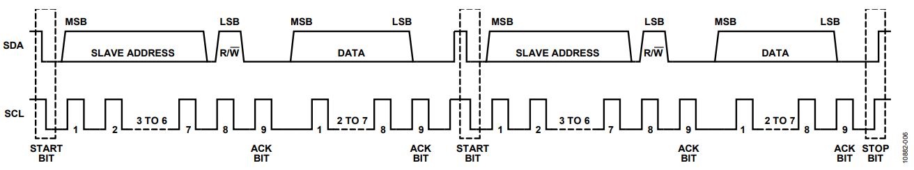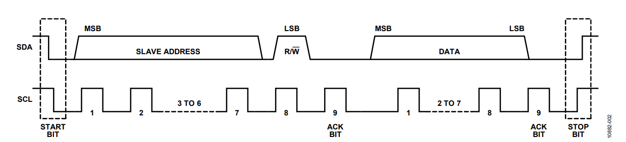 After the start condition, the master sends a byte, most significant bit (MSB) first, on the SDA line, along with eight SCL pulses. The first seven bits of this byte is the 7-bit slave address. The slave only responds to the master if this 7-bit address matches the address of the slave device (or one of the four slave addresses). The eighth bit, the least significant bit (LSB), is the R/W status bit. The R/W status bit determines the direction of the message. If this bit is low, the master writes data to a selected slave. If this bit is set, the master expects to receive data from the slave. The master generates the clock in both cases.