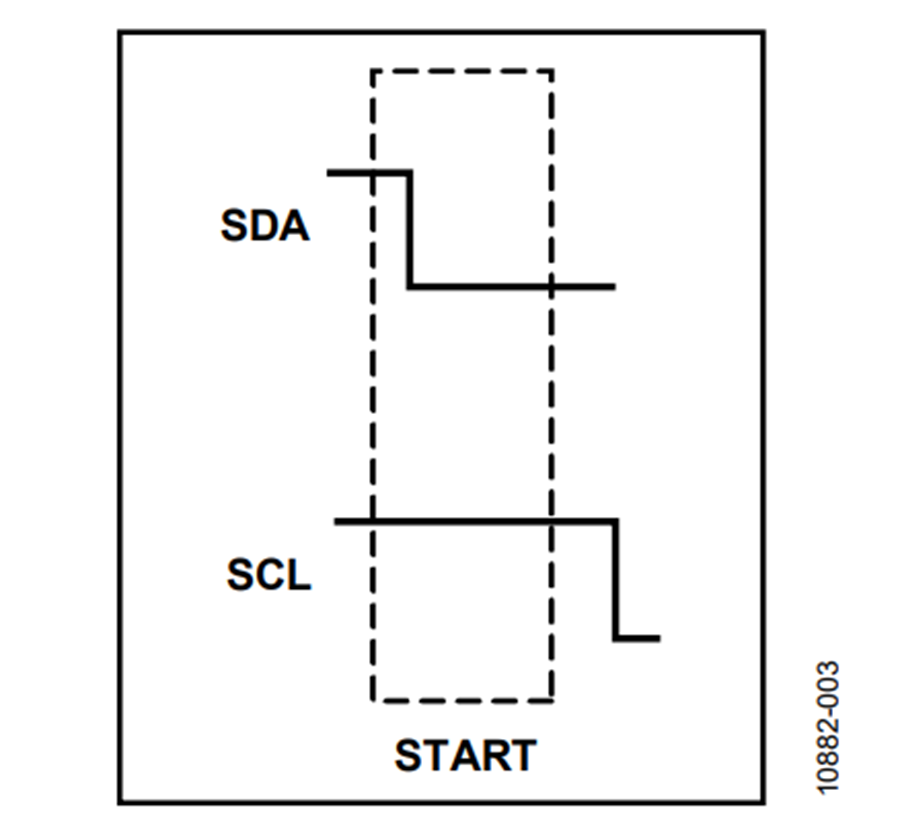 A typical data transfer sequence for an I2C interface starts with the start condition. The start condition is simply a high to low transition in the SDA line while the SCL line is pulled high (see Figure 3). The master is always responsible for generating the start condition. The start (and stop) conditions are the only times that the SDA line should change during a high period of the SCL line. During normal data transfer (including slave addressing), the data on the SDA line must be stable during the high period of the SCL line.