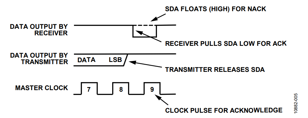 If the slave address matches the address sent by the master, the slave automatically sends an acknowledge (ACK). Otherwise, it sends a no acknowledge (NACK). An ACK is seen as a low level on the SDA line on the ninth clock pulse. A NACK is seen as a high level on the SDA line on the ninth clock pulse (see Figure 5).
