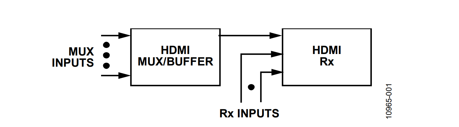 A standard means to increase the overall number of HDMI inputs to a system is to use an HDMI mux with several inputs whose output feeds one of the inputs of an HDMI receiver. This results in two cascaded stages to handle the TMDS signals before they are digitally processed in the receiver (see Figure 1)