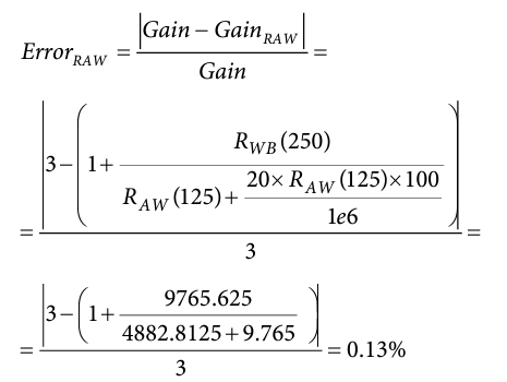In this case, to assume the 20% tolerance error is negligible R2 >> RWB; or, in other words, the output error can be improved by reducing the adjustable output gain and increasing the settling time. The final resistance is defined in Equation 3.