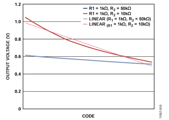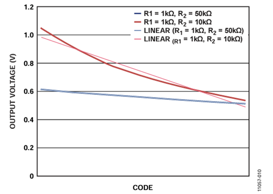 Enabling this mode, the output voltage can be linear, fixing the value of one resistor string, that is, RWB, and setting the other string, RAW. The mode of operation is similar to using the digipot in rheostat mode in conjunction with a discrete resistor, but in this case the overall tolerance error is below 1% without using any external parallel or series resistance combination.