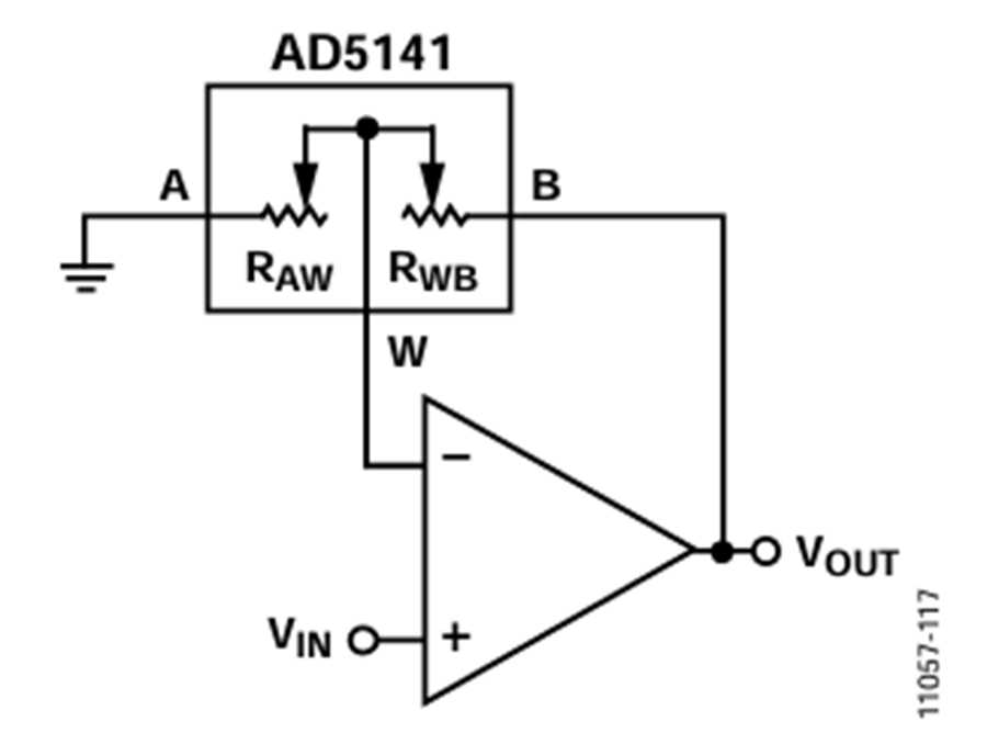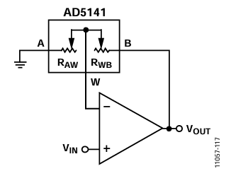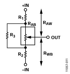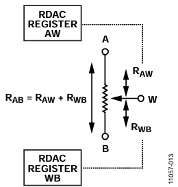 Using the digipot in potentiometer mode in these transfer equations is not straightforward since both resistors strings, RAW and RWB, are complementary; in other words, RAW = RAB − RWB, as shown in Figure 3.
