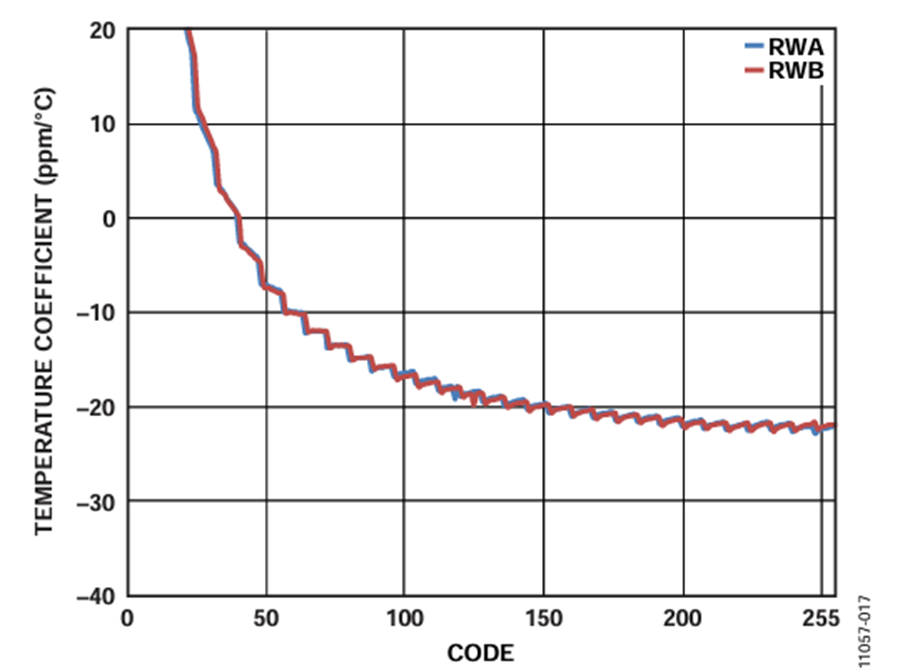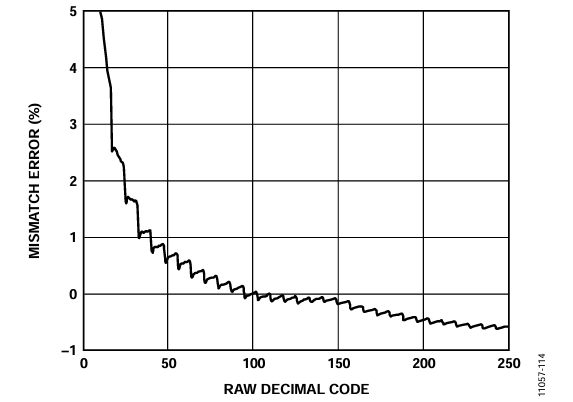 Figure 14 shows an example of sweeping RAW from zero scale to full scale, fixing RWB at midscale for a 10 kΩ digipot. Analyzing the plot in detail, at lower codes when the resistances, RAW or RWB, are small, the mismatch becomes higher than ±1%. This is due to an error added by the non-negligible effect in the internal CMOS switches resistance.