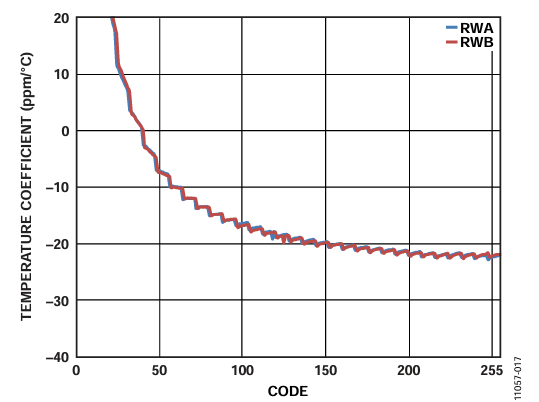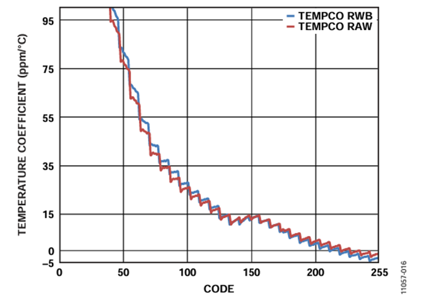 Similar to the resistance match error, at lower codes the switch resistance tempco is dominant, but the effect is minimizing at higher codes.