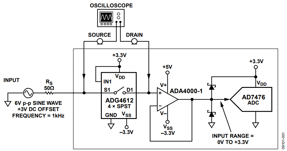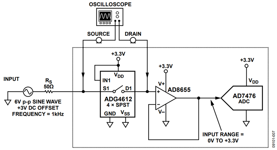 Figure 1 shows a single channel, fault-protected data acquisition signal chain that is made up of the ADG4612, ADA4000-1, and AD7476. The key to protecting the data acquisition board is the protection features of the ADG4612. The switch is in the isolation mode when no power supplies are present, that is, when VDD is floating or VDD ≤ 1 V or when the input signal, either VS or VD, is greater than VDD supply plus a threshold voltage (VT). Under these condition, the switch inputs are high impedance inputs, ensuring that no current flows that can damage the switch or downstream circuitry. The negative supply rail, VSS, can be floating or 0 V to −5.5 V. The ground pin must be connected to the ground potential.