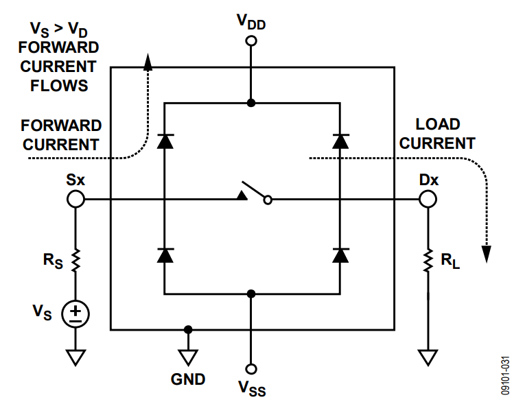 The source, drain, and logic terminals of standard CMOS switches have ESD protection in the form of clamping diodes to the supplies. This is illustrated in Figure 2. These diodes vary in size depending on the process but are generally designed to be small to minimize leakage current. In normal operation, the diodes are reversed biased and do not pass current. When forward biased, they are not rated to pass currents greater than a few mA and can be damaged if this current is exceeded. Whenever an analog switch input voltage exceeds the supplies, the diodes become forward biased and large currents can flow, meaning that the switch can be damaged, even if the supplies are turned off. Furthermore, the damage caused by a fault is not limited to the switch but can also affect downstream circuitry such as the ADA4000-1 because applying a signal to an unpowered ADA4000-1 exceeds the absolute maximum rating of the device.