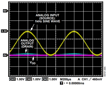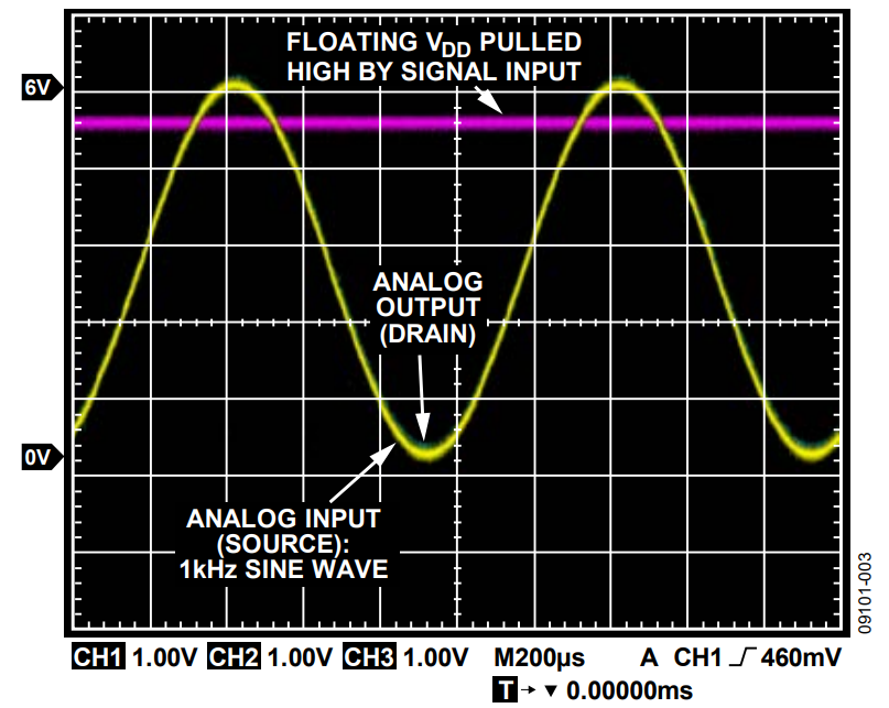 The waveform in Figure 3 shows the performance of a standard analog switch when a signal is applied while the supplies are floating. A 6 V p-p sine wave with a 3 V dc offset is applied to the analog inputs, which in turn supply the power through the internal ESD diodes powering up the switch and any other components connected to the same VDD supply. The input signal passes through the switch and is present at the ADA4000-1 inputs, thereby exceeding the maximum ratings of the ADA4000-1.