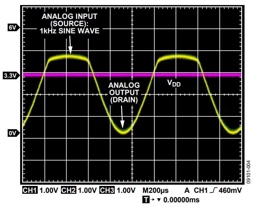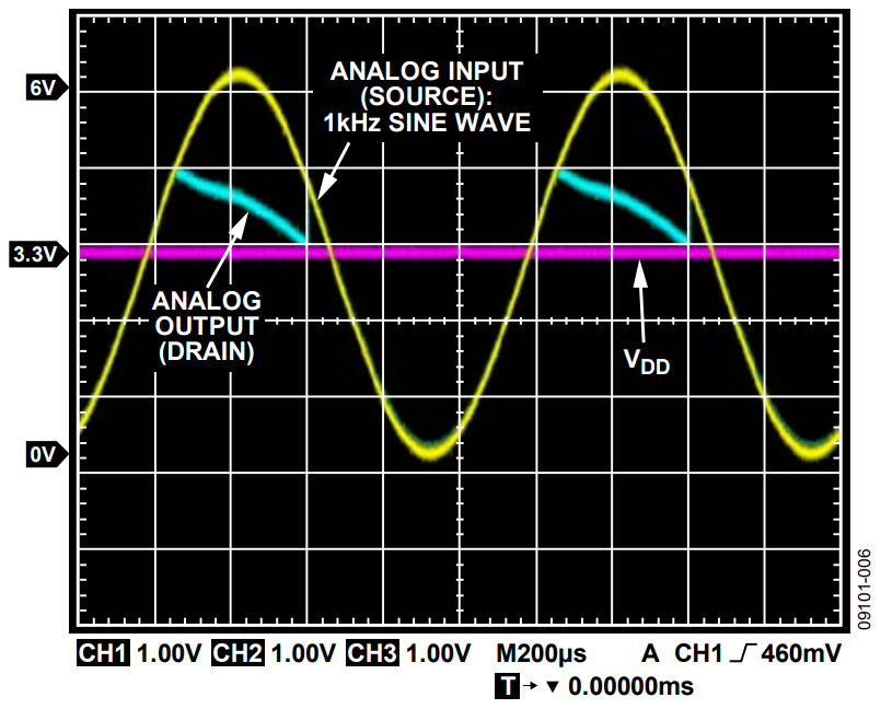 Figure 6 shows the result of an overvoltage fault on the analog inputs. In this case, a 6 V p-p sine wave with a 3 V dc offset is applied to the ADG4612, which is powered from ±3.3 V supplies. When the analog input exceeds VDD by a threshold voltage, VT (~1.2 V), the switch enters isolation mode, thereby preventing the fault from damaging downstream circuitry.