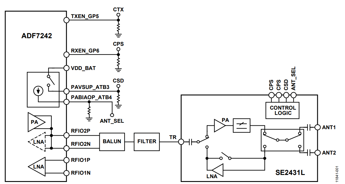 Figure 1. Block Diagram of the ADF7242 on Left Connected to the SE2431L on Right.