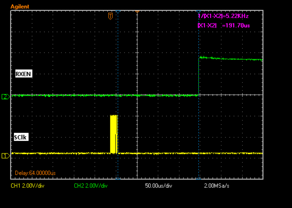 Figure 7. Time from RC_RX Command Write (Last SCLK Edge) to RXEN High with mac_delay timer Set to 192 µs.