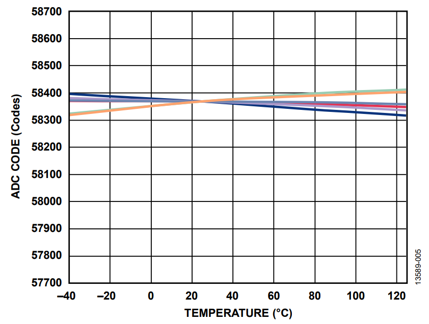 By looking at a sample of typical devices over the full operating temperature range, it is possible to determine the drift profile of the ADC. Figure 2 shows the offset drift profile for a sample of AD7403 devices.