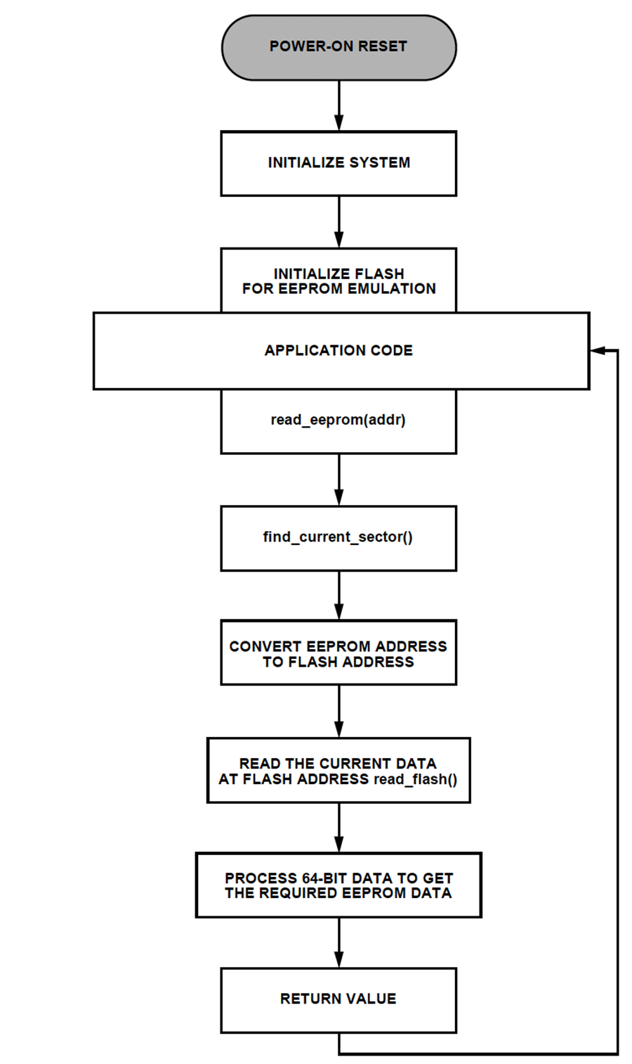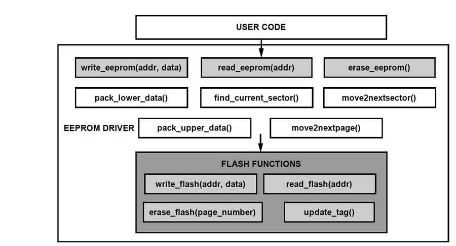 EEPROMの書込みおよび読出し機能には、EEPROMのデータやアドレス情報など、アプリケーション・コード入力の処理が含まれます。EEPROMのAPI(Application Programming Interface)は、フラッシュ・インターフェースの条件に従ってデータやアドレス情報を処理し、提供します。