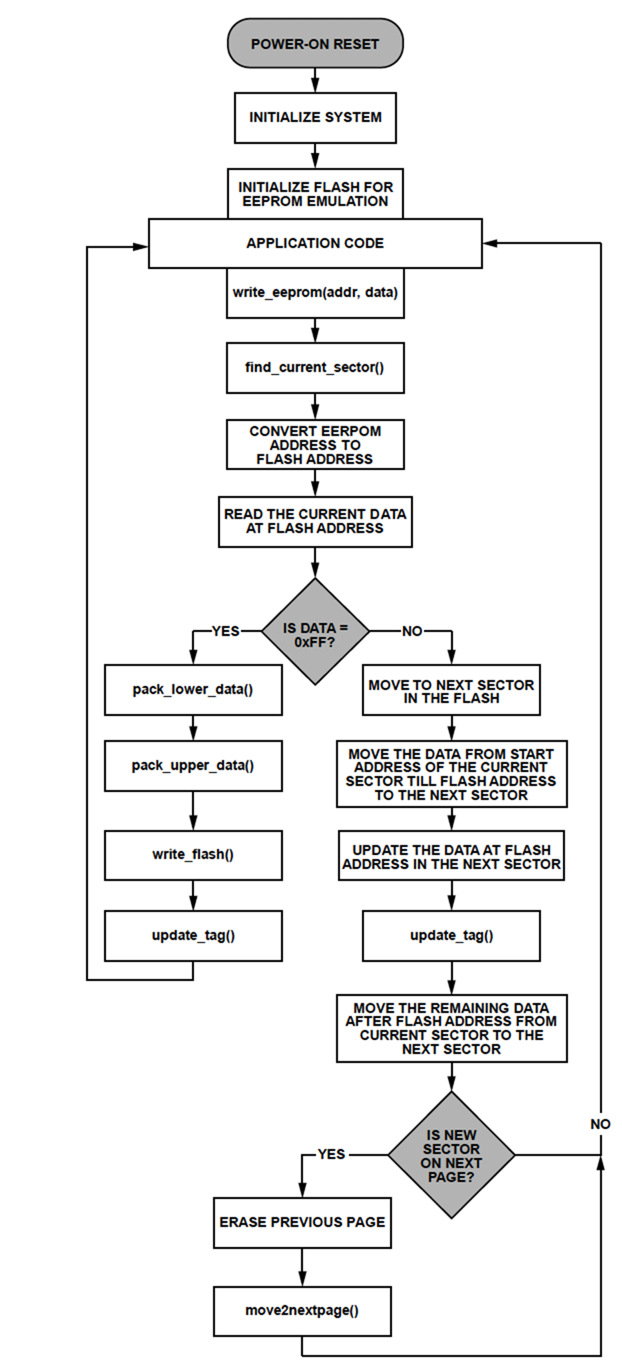 得られたフラッシュ・アドレスにデータが既に存在する場合、データ読取り関数は0xFFを返しません。この場合、得られたフラッシュ・アドレスの前後にあるデータは、move2nextsector()関数を呼び出すことによって、次のセクタ、つまり隣接セクタに移動します。EEPROMデータは、LSBおよびMSBデータ・パケットに変換され、次のセクタの新しいフラッシュ・アドレスに書き込まれます。既に書込み済みのEEPROMのロケーションに書込み命令が送出されるたびに、データは、変更されたデータを格納するロケーションを含む次のセクタに移されます。