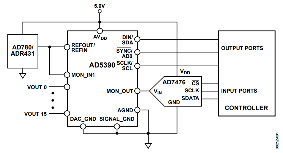 The combination of the AD5390/AD5391/AD5392 and the AD7476 provides a complete 8-channel or 16-channel analog output control solution with an efficient monitor function for system debug, as well as fault and diagnostic analysis.