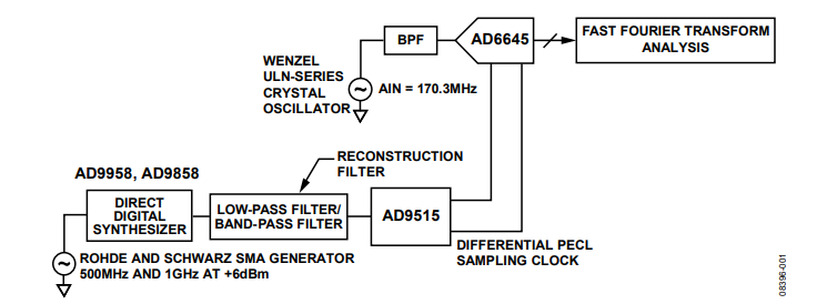 The circuit configuration in Figure 1 shows a DDS-based clock generator, which consists of DDS followed by a reconstruction filter and an AD9515 clock distribution IC that are used to provide the sampling clock for an ADC. The DDS sampling clock is derived from a Rohde and Schwarz SMA signal generator. The jitter measurement was made by using the clock derived from the DDS and the AD9515 as the sampling clock for the high performance AD6645 14-bit, 80 MSPS/105 MSPS ADC. The analog input signal for the ADC is a filtered 170.3 MHz sine wave derived from a low jitter Wenzel crystal oscillator. Data was taken on the AD9958 (500 MSPS) and the AD9858 (1 GSPS).