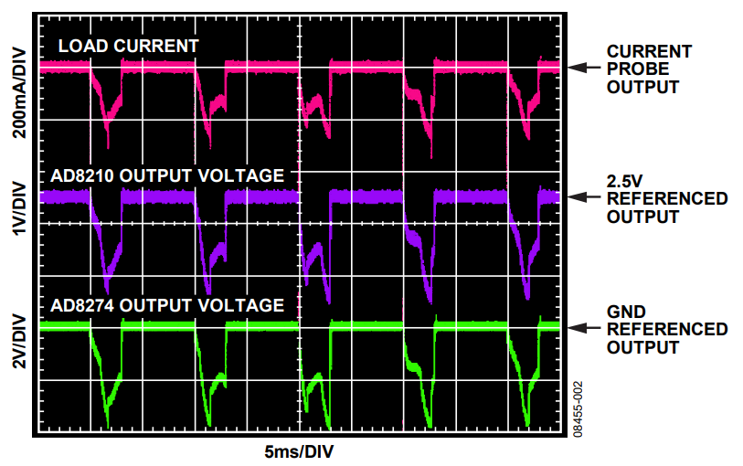 The current to the load flows through the resistor, RS. The voltage across the RS resistor is amplified by the AD8210 by an initial gain of 20 V/V. The AD8210 can withstand an input common-mode voltage that varies from −2 V to +65 V. The high CMRR of the AD8210 makes it possible to monitor current even in the presence of a pulse width modulator (PWM) common-mode signal, as in the case of monitoring phase current for motors driven in an H-bridge configuration. Figure 2 shows typical waveforms when monitoring a PWM motor current, and Figure 3 shows the circuit overload characteristic.