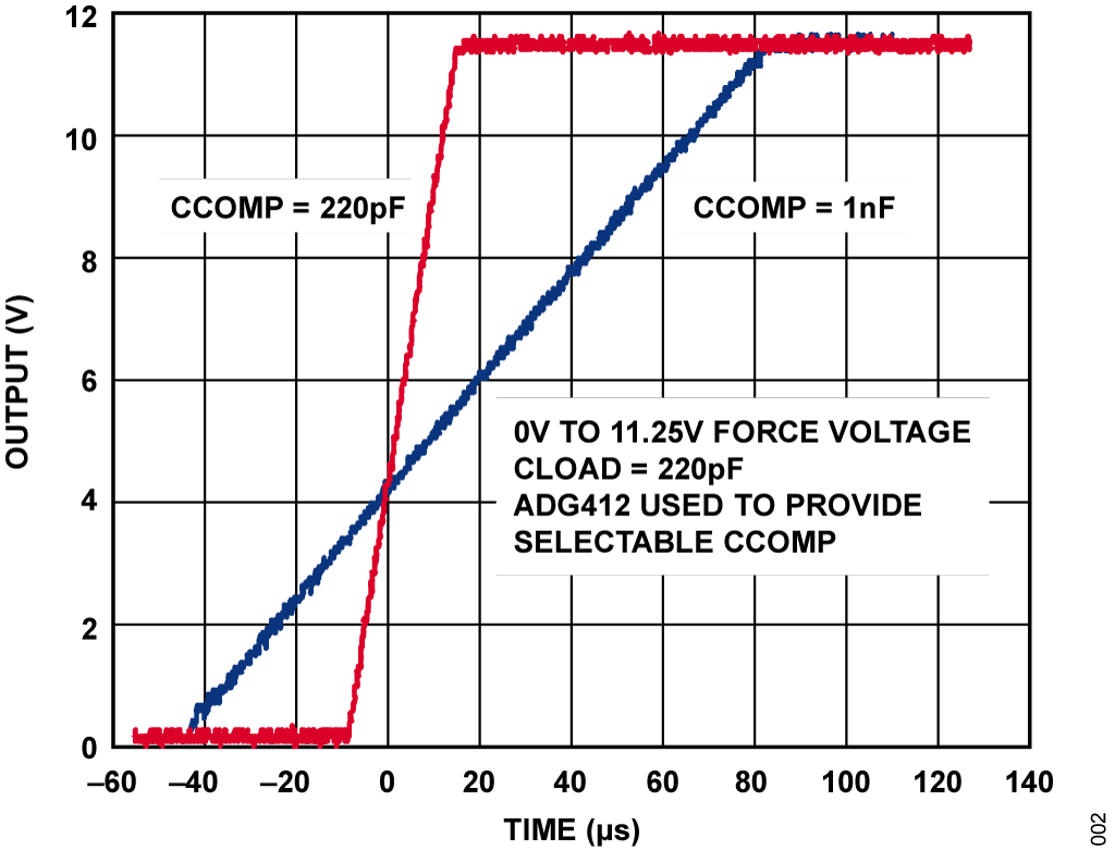 Some applications require the PMU to drive a wide range of DUT capacitances, especially applications where the PMU is connected to a power supply pin or where the PMU is used as a device power supply and will see the decoupling/bypass capacitance of the DUT. In such cases, an external switch connected to the CCOMP pin, rather than a fixed capacitor, allows for additional CCOMP capacitors to be switched in and out, thereby allowing for optimization of settling time and stability with various capacitive loads. The switch chosen for this circuit was the ADG412 quad SPST, which has an on- resistance of less than 50 Ω. The quad SPST switch was chosen instead of a multiplexer because most multiplexers allow only one of a number of channels to be on at any one time. Using the quad switch, each of the drains can be connected together and the sources connected to the each of the compensation capacitors, thereby providing 24 − 1 possible combinations of CCOMP.