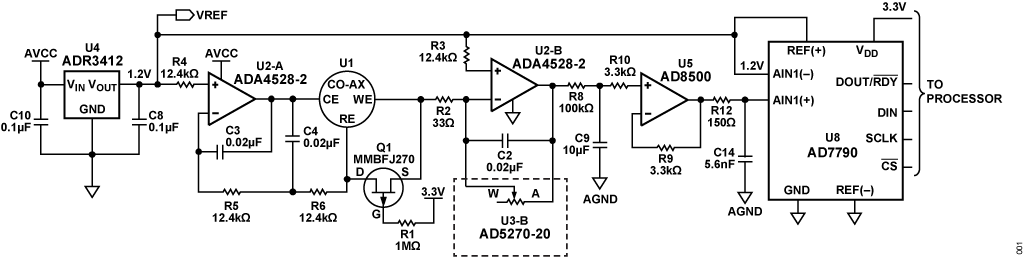The current into the WE terminal is less than 100 nA per ppm of gas concentration; therefore, converting this current into an output voltage requires a transimpedance amplifier with a very low input bias current. The ADA4528-2 op amp has CMOS inputs with a maximum input bias current of 220 pA at room temperature, making it a very good fit for this application.