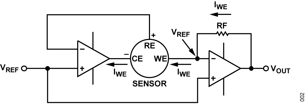 Figure 2 shows a simplified schematic of an electrochemical sensor measurement circuit. Electrochemical sensors work by allowing gas to diffuse into the sensor through a membrane and by interacting with the working electrode (WE). The sensor reference electrode (RE) provides feedback to Amplifier U2-A, which maintains a constant potential with the WE terminal by varying the voltage at the counter electrode (CE). The direction of the current at the WE terminal depends on whether the reaction occurring within the sensor is oxidation or reduction. In the case of a carbon monoxide sensor, oxidation takes place; therefore, the current flows into the working electrode, which requires the counter electrode to be at a negative voltage (typically 300 mV to 400 mV) with respect to the working electrode. The op amp driving the CE terminal should have an output voltage range of approximately ±1 V with respect to VREF to provide sufficient headroom for operation with different types of sensors (Alphasense Application Note AAN-105-03, Designing a Potentiostatic Circuit, Alphasense, Ltd.).