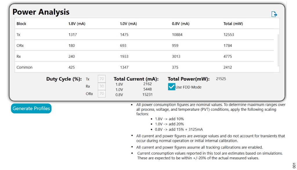 The configurator is used to load a previously generated use case. Subsequent configurator pages can be used to customize by configuring the local oscillator (LO), carrier digital upconverter (DUC), transmitter bandwidth, and JESD settings, to arrive at and validate a required ADRV904x use case. Current is dependent on the configuration, therefore a power analysis page is provided to give current drain per use case. Figure 1 shows the configurator power analysis tool. Here each domain current is listed for each of the signal chain blocks and total current is provided in Figure 1. A checkbox is provided to select FDD mode. This enables all signal blocks, therefore providing the highest current drain for the use case. Alternatively, the TDD duty cycles for the transmitter, receiver, and observation path receiver can be adjusted from 0% to 100% providing an average current for a TDD frame. Setting duty cycles to 100% gives similar results as checking FDD mode. The numbers provided in the table are typical numbers. To determine maximum values to account for IC manufacturing process, voltage variation, and temperature variation (PVT), an additional factor must be added. These values are shown in Figure 1, for 1.8 V add +10%, for 1.0 V add 20%, and for 0.8 V add 15% plus an additional 3125 mA for what is referred to as digital leakage current.