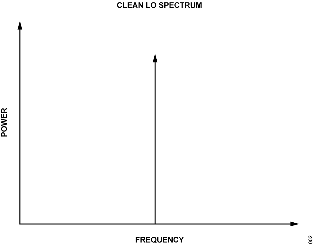 Figure 2 shows in the frequency domain a pure sine-wave tone. Figure 3 shows a possible frequency domain of a power supply that contains a specific ripple frequency and its harmonics. For the LO path, there is a case where AM to PM conversion can take place, which causes the power-supply ripple to be transferred to the LO as phase modulation. This is shown in Figure 4.