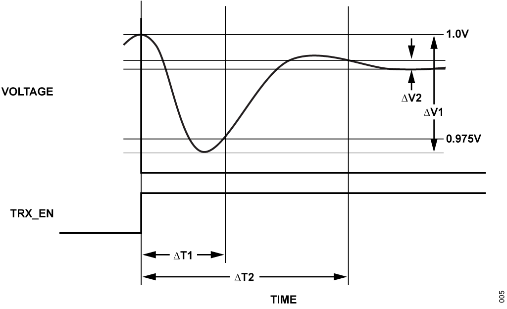 Figure 5 is a diagram that shows the requirements of settling time of the 1.0 V supply domain. The disturbance is caused by turning on all the transmitter channels simultaneously during a TDD slot. A sudden drop in the 1.0 V supply occurs, when these circuits are enabled. First symbol transmitter EVM can be impacted by power-supply settling with large amplitude variation and long duration. Minimizing settling time and ripple are important for optimizing EVM.