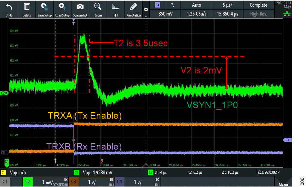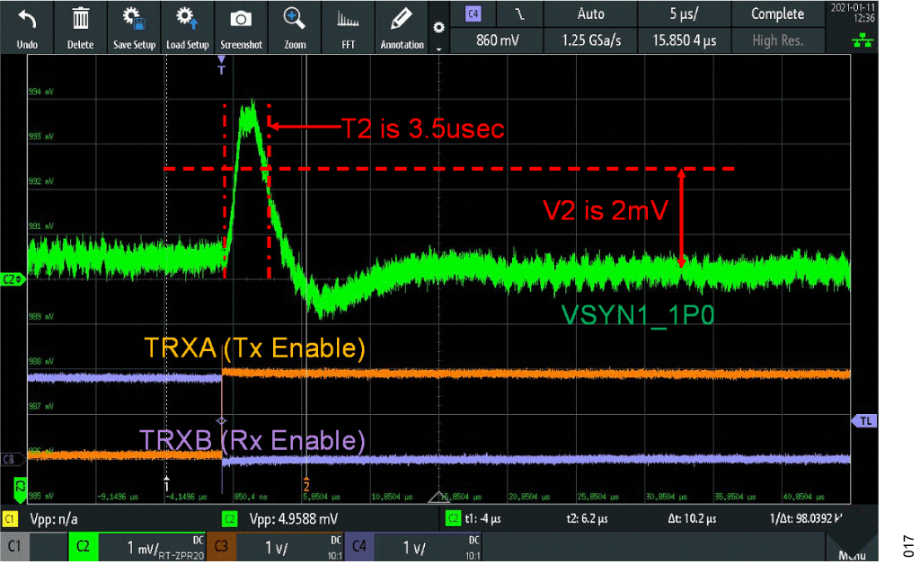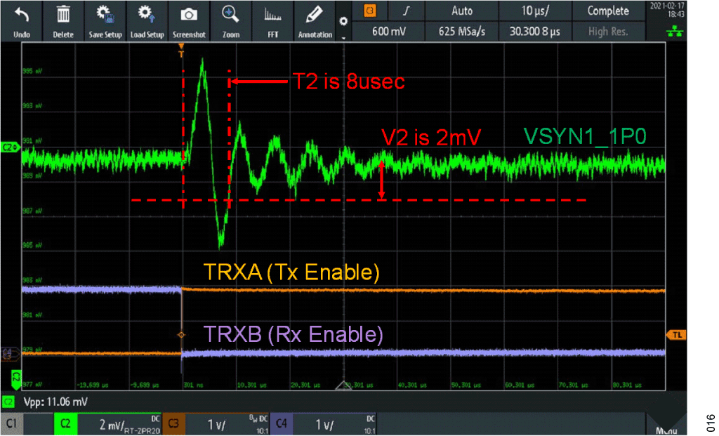 Ferrite beads are passive component that is traditionally used to suppress high-frequency signals on electronic circuit boards. The ferrite bead has an inductive response at a particular range of frequency, which effectively absorbs high-frequency transients by raising their resistance at higher frequencies. It is determined on the EVB that when operating in TDD mode that this series resonance impacts the transient response duration, which then results in higher first symbol EVM. The ferrites are removed, and the capacitors located close the IC are left in place. Characterization is done comparing receiver and transmitter spurious with and without having these beads installed. It is concluded that there are no significant differences in these spurious tests when the ferrites are removed. If the version of BOM has the ferrites installed, it is recommended to remove them when operating in TDD mode. Measured 1.0 V supply transients are provided to show the TDD response with and without the ferrite beads installed. Transmit channels are enabled as receive channels are disabled to create a TDD supply transient. Figure 16 is with ferrites beads installed it takes 8 µs (ΔT2) to settle to within 2 mV (ΔV2). And with ferrite beads removed the 2 mV time has been reduced to 3.5 µs (Figure 17).