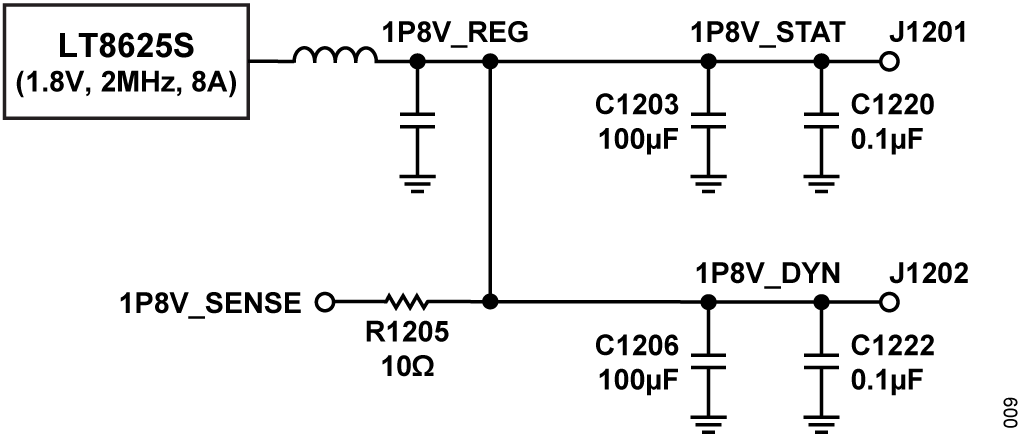 The details of the 1.0 V and 1.8 V connections are shown in Figure 8 and Figure 9 respectively. The filters have been simplified to only bypass capacitors close to the DUT as possible.