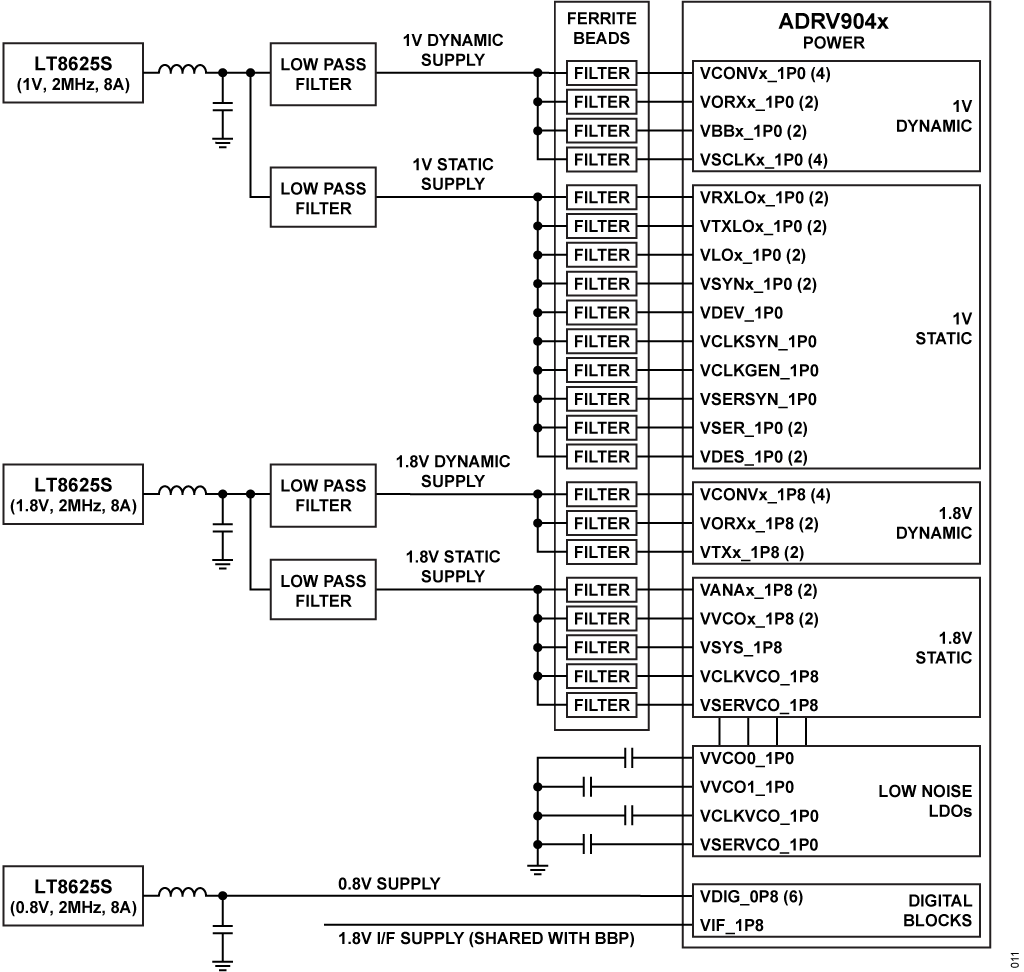 The outputs of each of the regulators are then distributed to the balls of the ADRV904x through PCB traces and passive components. The passive components and connections can differ depending on the modes of operation of the ADRV904x.
