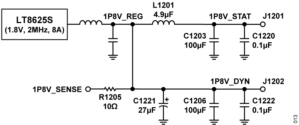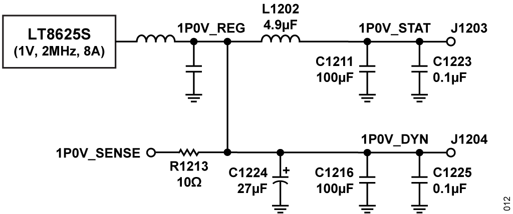 Figure 11 shows the design of the power supply for FDD mode of operation. A low-pass filter is inserted between the static and dynamic domains to isolate any transients from the dynamic domain from the static domain to keep any ripple below the specification. The details of the 1.0 V and 1.8 V isolation filter are shown in Figure 12 and Figure 13, respectively.