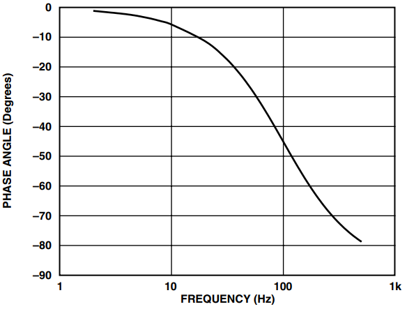 All ADXL series low g (<20 g) accelerometers use a single-pole RC filter where the resistor is internal and the capacitor is external. The user sets the bandwidth, and indirectly the phase response, by his or her choice of capacitor value. The phase response of a first-order (RC) system is defined as