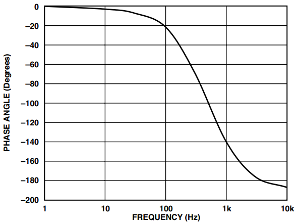 The second pole is normally used to set the actual bandwidth of the gyro. It is a classic single-pole RC filter (the R is the internal ROUT resistor of 180 kΩ, and the C is the external COUT). The phase response for a 100 Hz bandwidth would be very similar to that of the single-pole accelerometer shown in Figure 3.