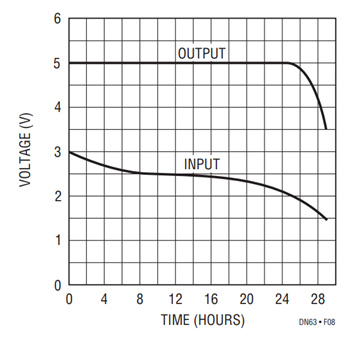 The three regulators show substantial differences in operating life. The linear regulator operates for 16.5 hours, as shown in Figure 6. Figure 7 shows a 19 hour operating life for the step-down switching circuit. The step-up regulator circuit’s performance, detailed in Figure 8, yields an operating life of 26 hours. This is an increase of 58% over the linear step-down approach at less cost and 37% over the switching step-down approach.
