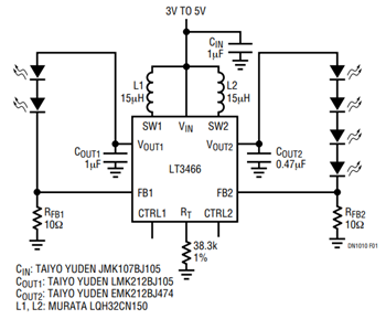 Design Note 1010: Dual White LED Driver Features Integrated Switches and Schottky Diodes in 3mm × 3mm DFN Package
