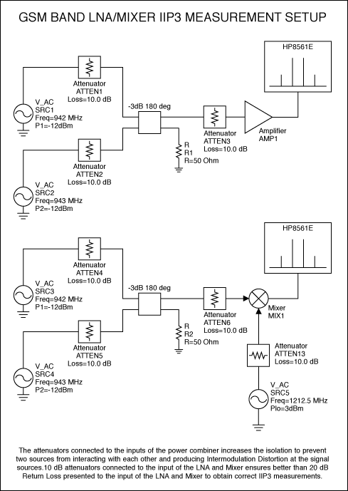 GSMバンドのLNAとダウンコンバータのIIP3を測定するためセットアップ
