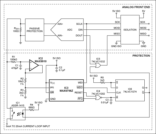 Figure 1. This circuit protects the isolated analog front end (AFE) of a current loop. For simplicity, we don't show the power and ground connections (+5Viso and GNDiso) for IC2, IC4, IC5, and IC6.